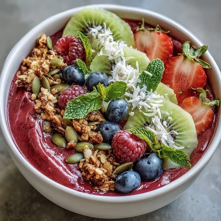 - Fresh berries, kiwi, pumpkin seeds, shredded coconut, and mint (for topping): These arrange the bowl and add texture layers that keep things interesting with every spoonful.