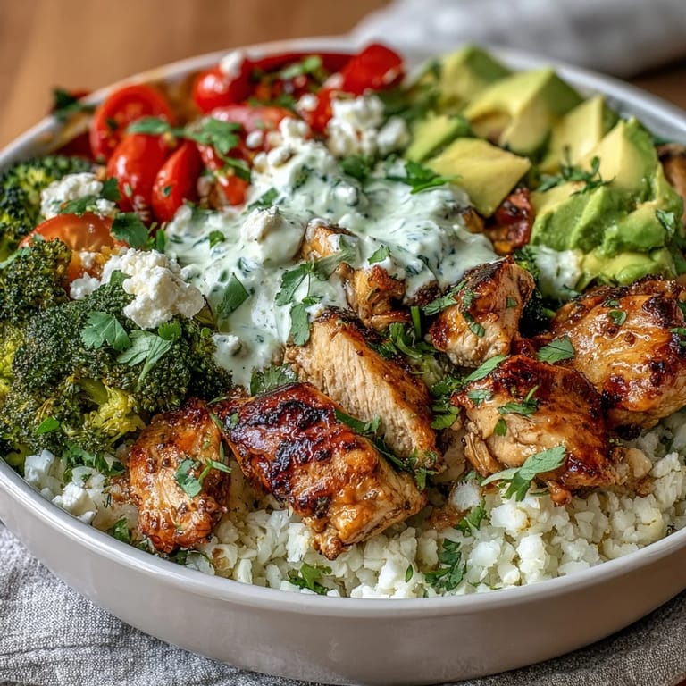 - Divide the cauliflower rice among your bowls, then arrange the chicken and vegetables on top like you're actually going to look at this before eating it. Layer in the cherry tomatoes, avocado slices, and fresh herbs so every spoonful has something different going on.