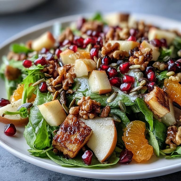 Pin it One December morning, my kitchen smelled like citrus and earth after I'd cracked open a pomegranate to find those jewel-like seeds practically glowing in the winter light. I was supposed to make something warming, something cooked, but instead I found myself reaching for walnuts and the last of the crisp apples from the counter. That spontaneous moment turned into this salad—a dish that proved you don't need heat to feel nourished when the right ingredients come together with intention.